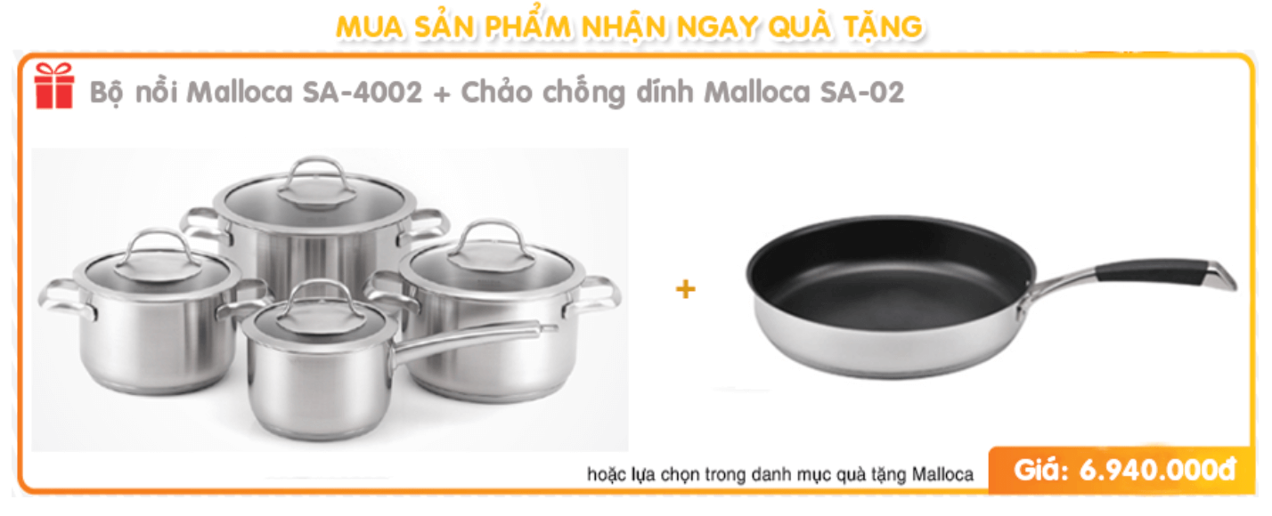 Tặng Thêm : - 01 Bộ nồi Inox cao cấp Malloca - 01 Chảo chống dính Malloca Trị giá : 6.940.000đ