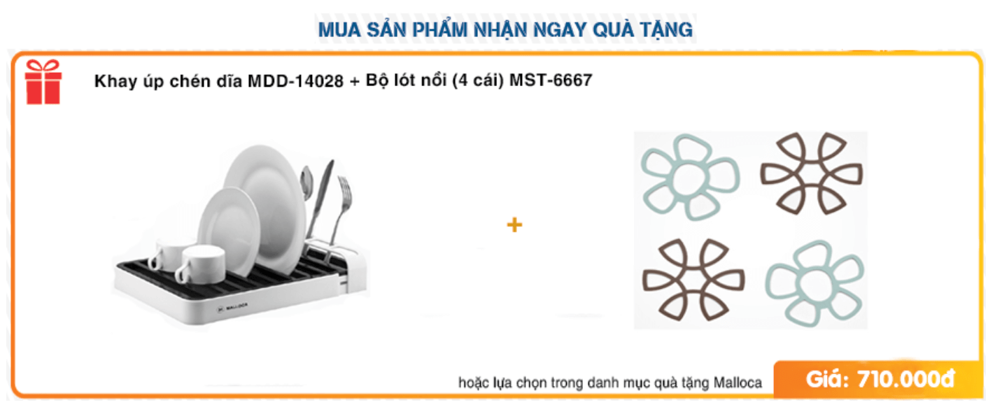 Tặng Thêm : - 01 Bộ lót nồi Malloca - 01 Khay úp chén Malloca Trị giá : 710.000đ