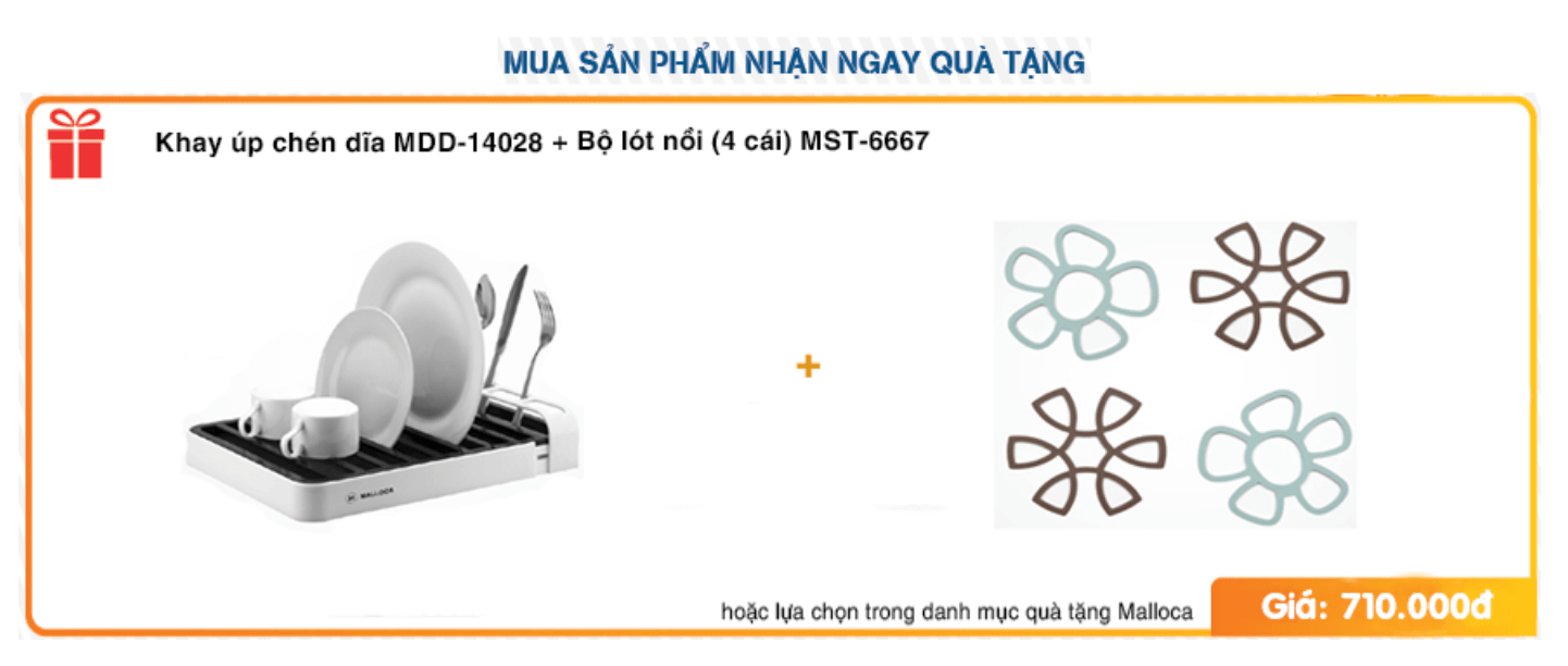 Tặng Thêm : - 01 Bộ lót nồi Malloca - 01 Khay úp chén Malloca Trị giá : 710.000đ
