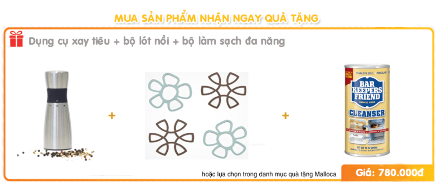 Tặng Thêm : - 01 Dụng cụ xay tiêu Malloca - 01 Bộ lót nồi Malloca - 01 Bộ làm sạch đa năng