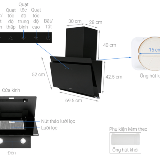 - Chế độ hút và khử mùi trực tiếp bằng than hoạt tính hoặc thoát ống ra ngoài, đường kính ống thoát 150 mm