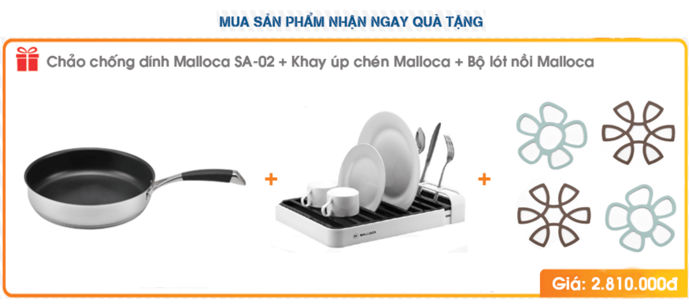 Tặng Thêm : - 01 Chảo chống dính Malloca - 01 Khay úp chén đĩa Malloca - 01 Bộ lót nồi Malloca