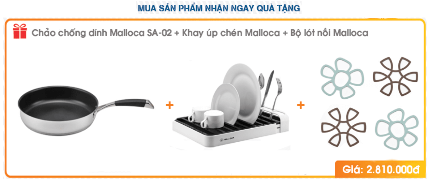Tặng Thêm : - 01 Chảo chống dính Malloca - 01 Khay úp chén đĩa Malloca - 01 Bộ lót nồi Malloca