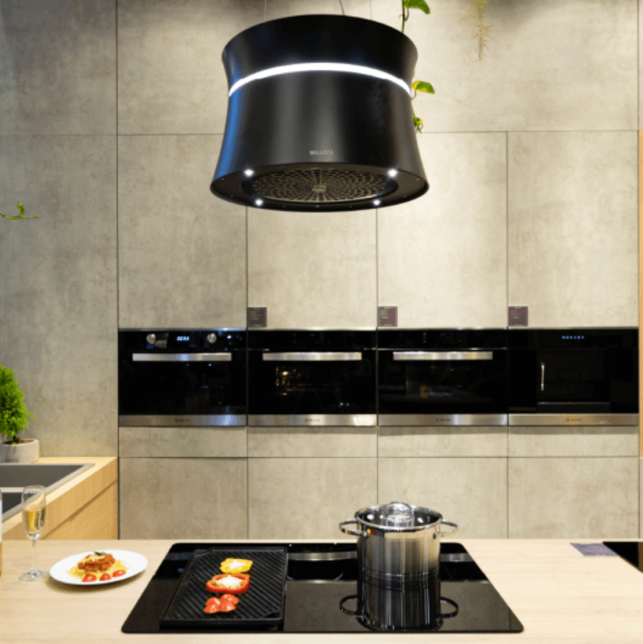 ( Hình ảnh thực tế máy hút mùi Malloca Sophie K-500B kết hợp bếp từ Malloca MI-784 ITG trong không gian bếp đảo )